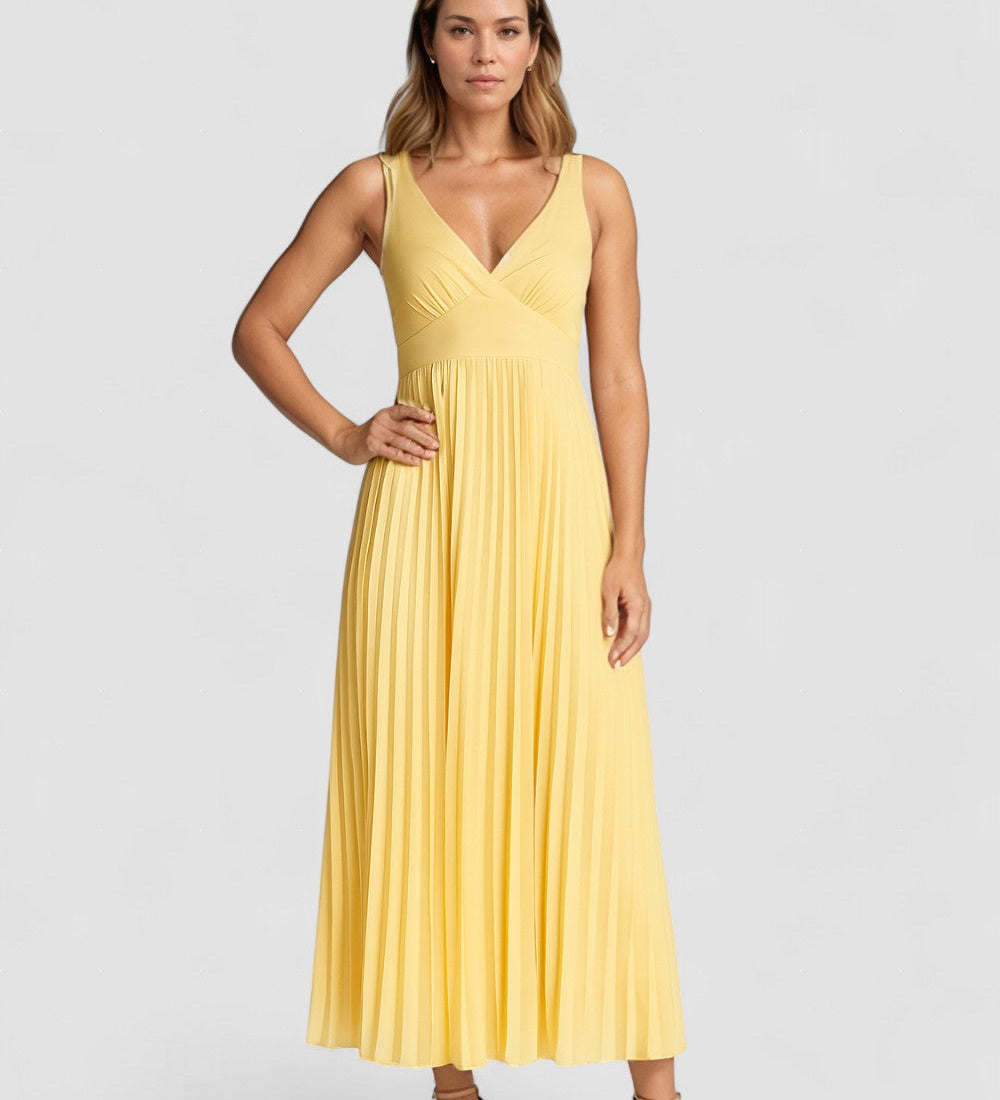 Alva – Rochie de Damă Midi Plisată cu Decolteu în V Galbenă