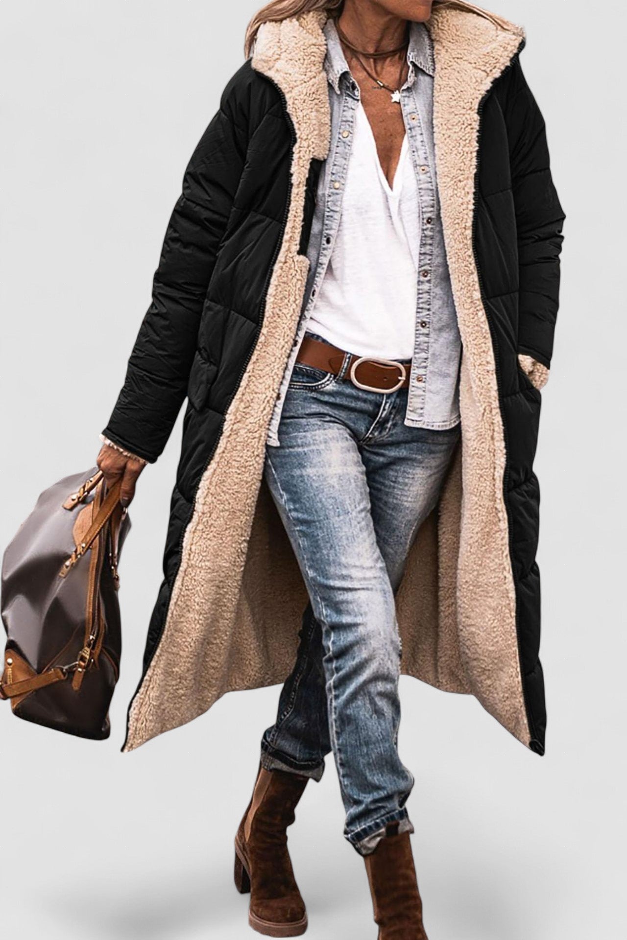 Johna – Mantou de Damă Reversibil din Sherpa cu Glugă Elegantă