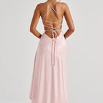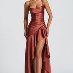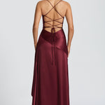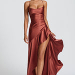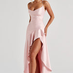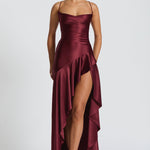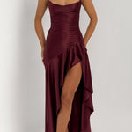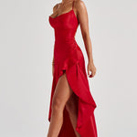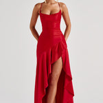 Rochia maxi Seraphine în roșu este alegerea ideală pentru a atrage toate privirile. Tivul dramatic High-Low, fusta pliată și fanta elegantă pe coapsă combină rafinamentul cu un aer încrezător – potrivită pentru seri romantice, evenimente formale sau petreceri elegante.
