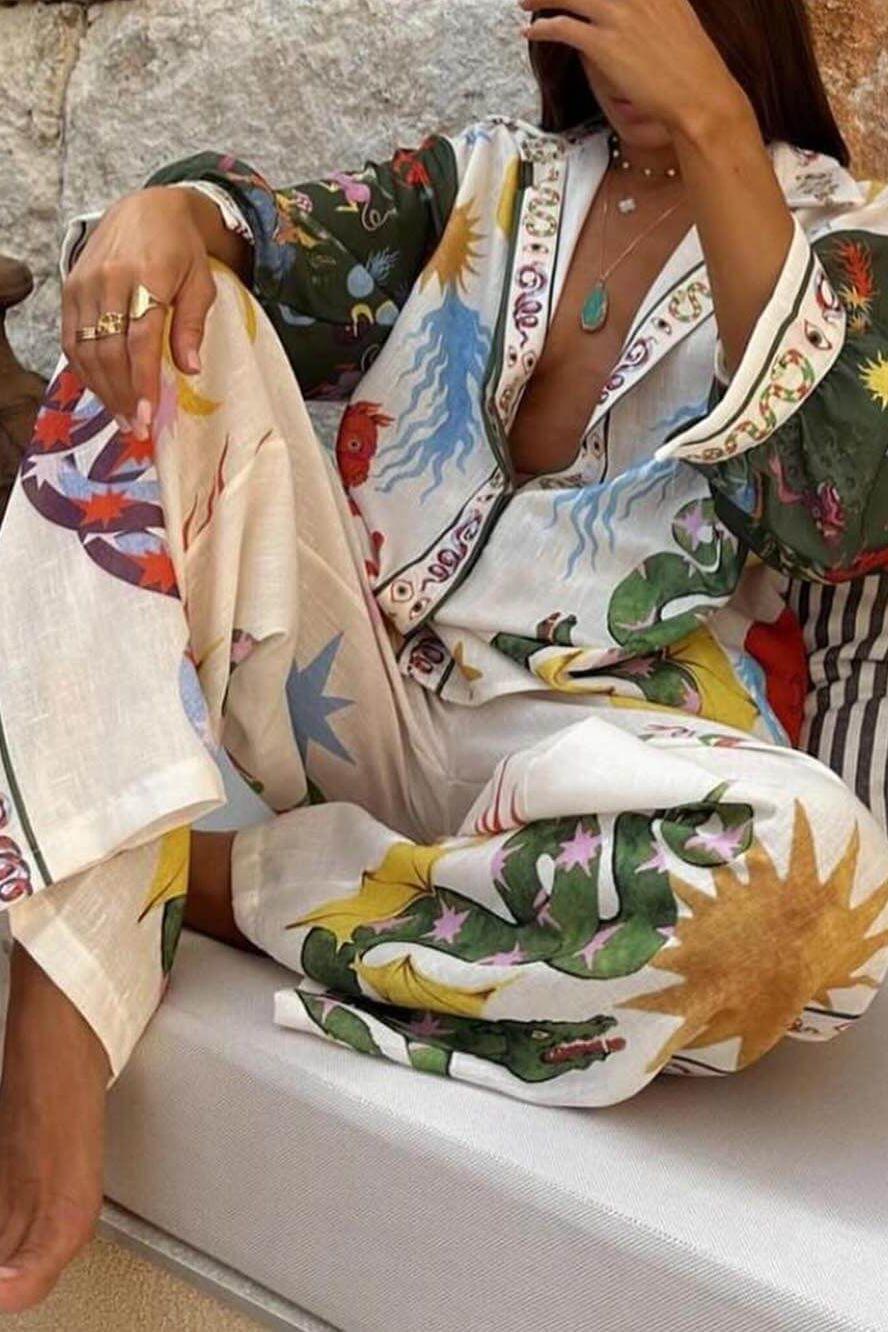 • Croială relaxată, dar rafinată – Cămașă fluidă cu nasturi asociată cu pantaloni cu talie înaltă, ajustați