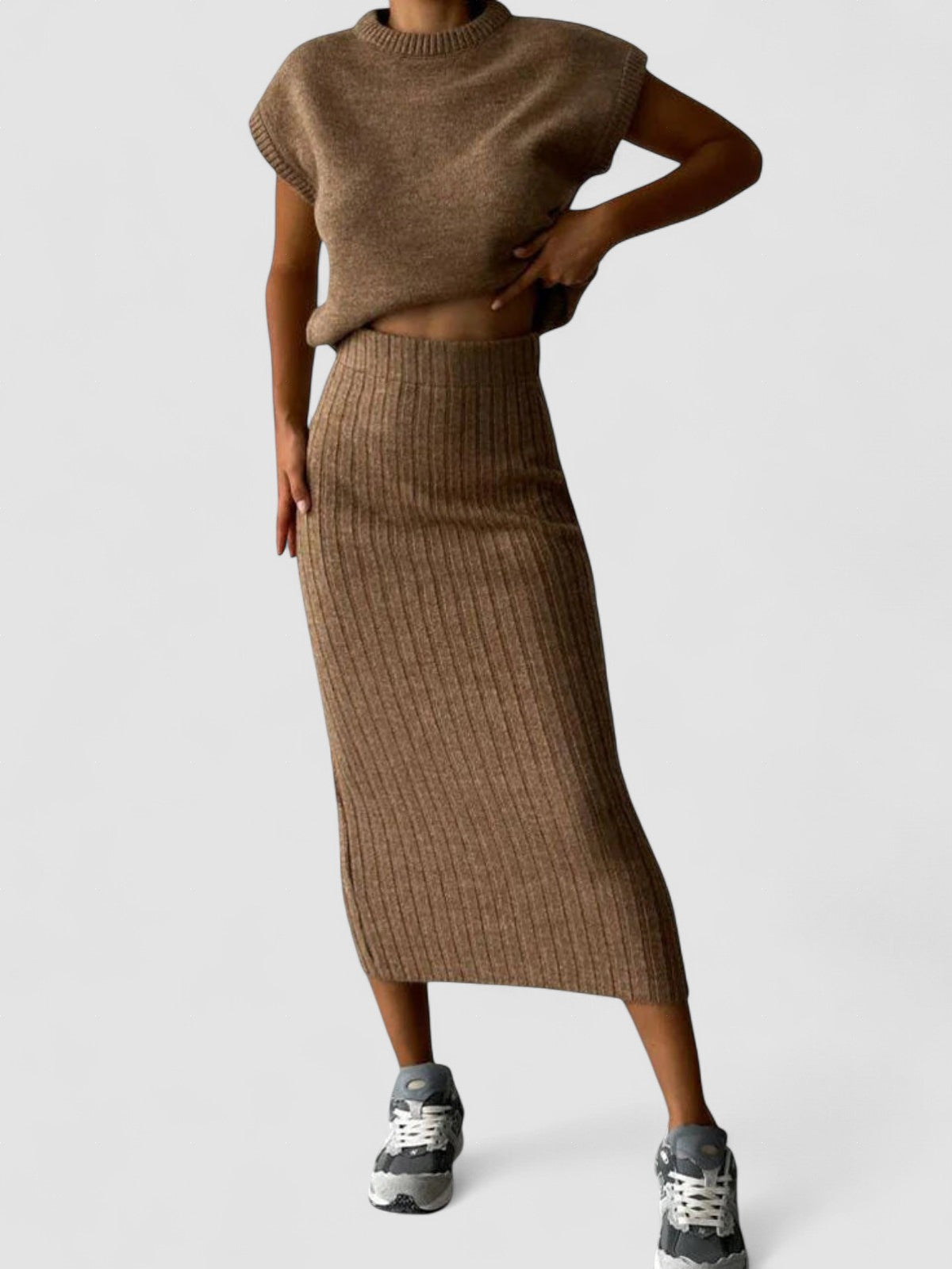 Design: Acest set include un top tricotat gros asociat cu o fustă midi tricotată cu talie înaltă, oferind un ansamblu confortabil și stilat.