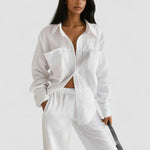 Design: Un set relaxat din două piese, format dintr-o cămașă cu nasturi și guler clasic și pantaloni cu picior larg pentru un look chic fără efort. Designul minimalist îmbunătățește versatilitatea și confortul.