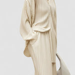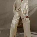 Design: Un set relaxat din două piese care include o cămașă oversized cu detalii de buzunare plisate, asociată cu pantaloni cu talie înaltă și picioare largi. Designul elegant și fără efort îmbină confortul cu sofisticarea modernă.