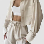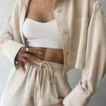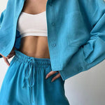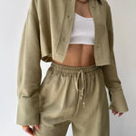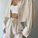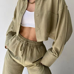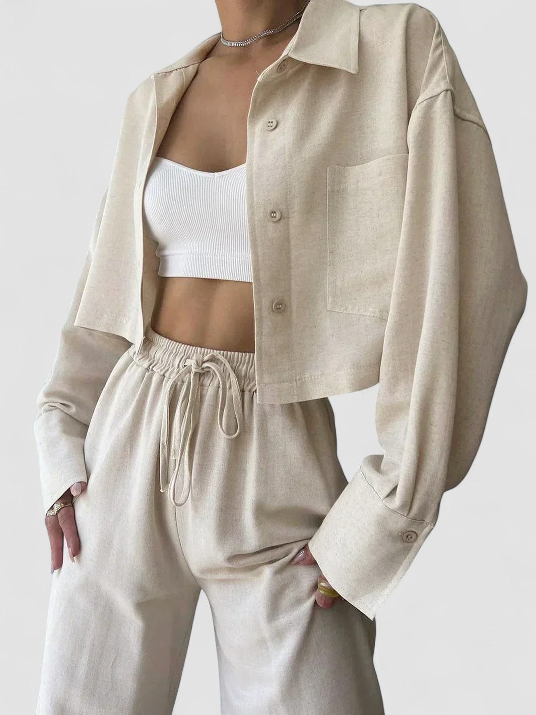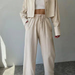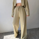 Design: Un set relaxat din două piese, cu un top cu guler și nasturi, cu o croială ușor supradimensionată, asociat cu pantaloni cu talie înaltă și șnur. Designul minimalist oferă un amestec perfect de confort și eleganță fără efort.