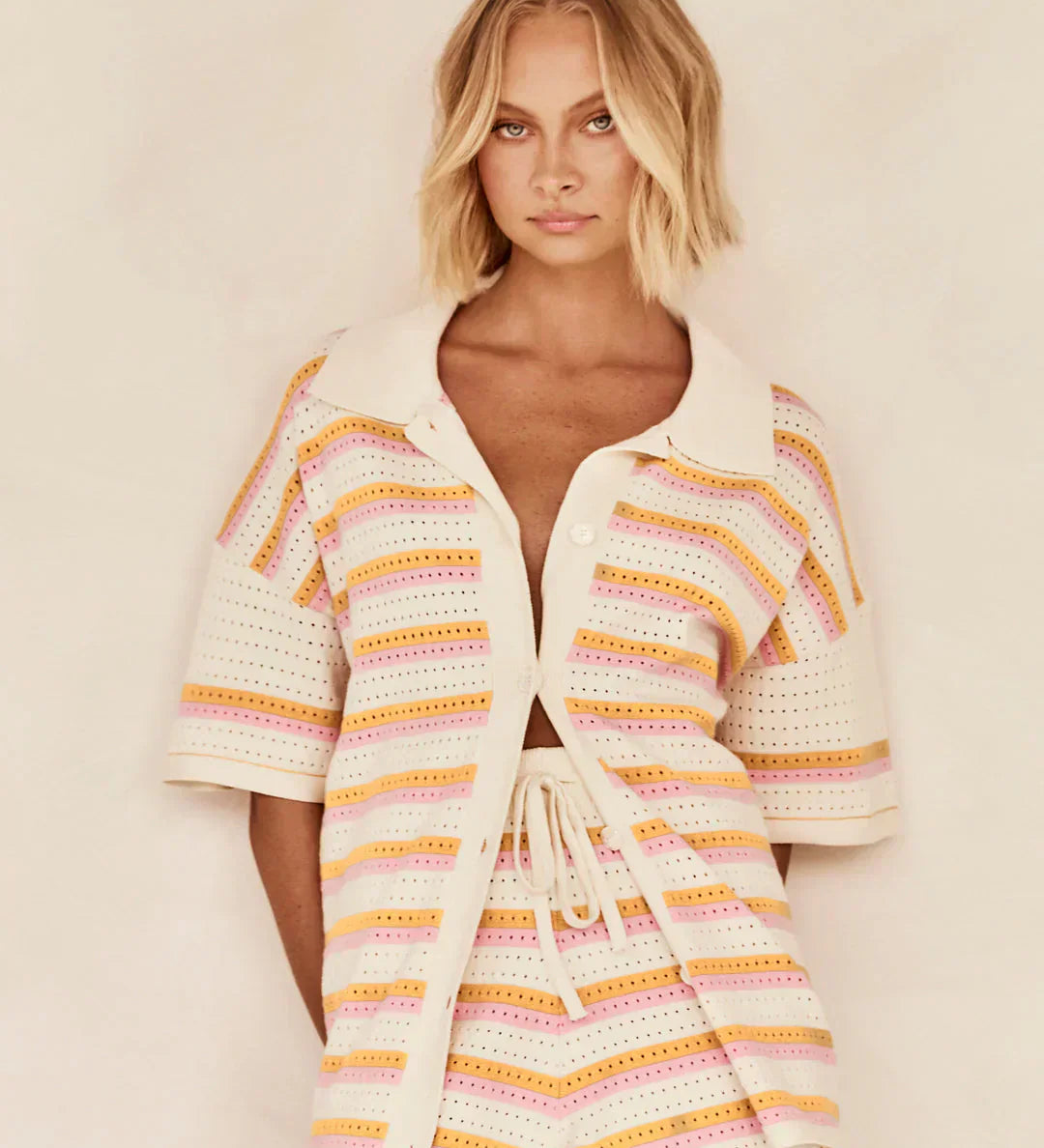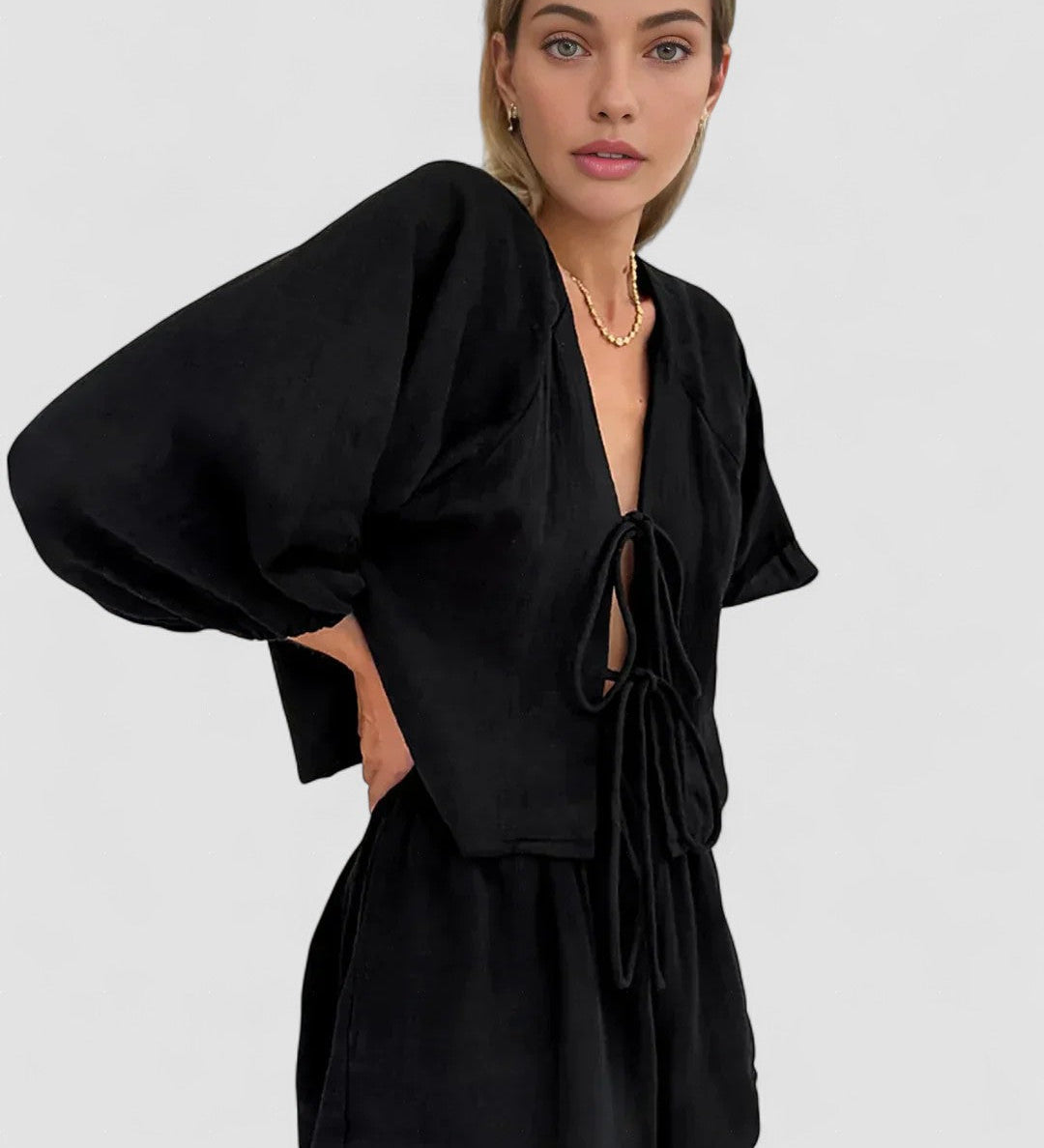 Set format din pantaloni scurți și bluză cu mânecă lungă, cu detaliu de fundă