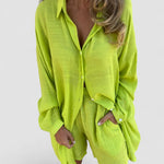 Setul constă dintr-o cămașă cu guler și mâneci lungi și un șort asortat cu talie înaltă, fiind ideal pentru orice ocazie: brunch, relaxare sau o plimbare pe plajă. Materialul ușor asigură un siluet fluid și aerisit pentru un confort optim și libertate totală de mișcare.